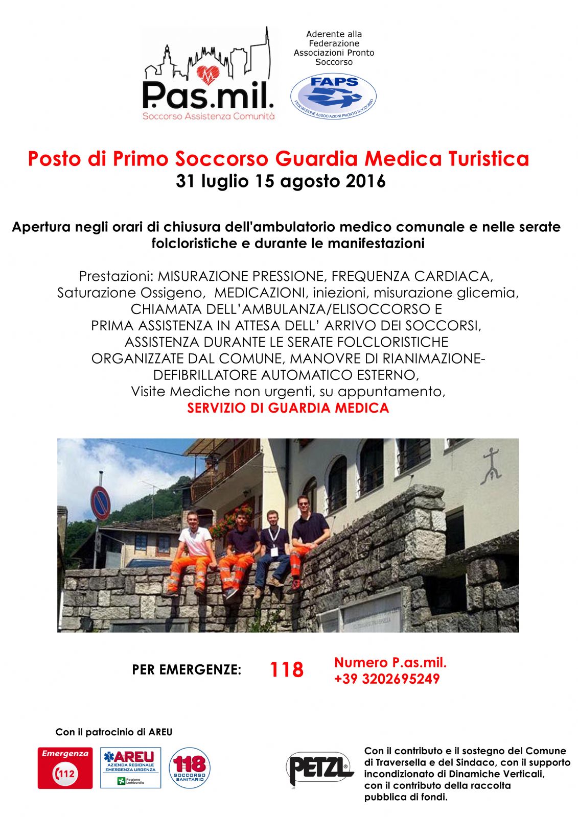 L’associazione di pubblica assistenza milanese, denominata P.as.mil. e il Comune di Traversella annunciano per il secondo anno consecutivo, l’inizio del progetto di Posto di Primo Soccorso Guardia Medica Turistica, fortemente voluto dal Sindaco Renza Colombatto.
